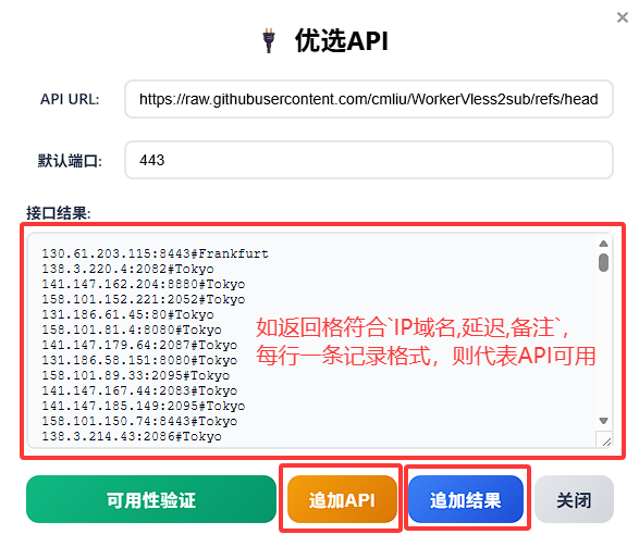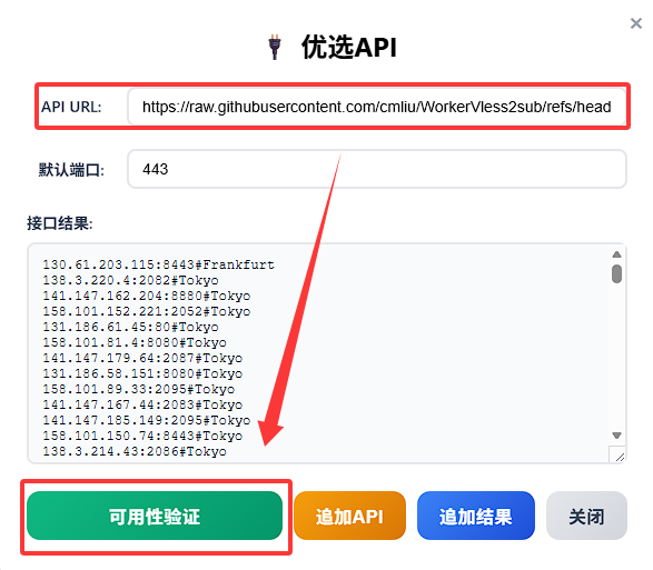https://github.com/cmliu/WorkerVless2sub/raw/refs/heads/main/CloudflareSpeedTest.csv,填写测速对应的默认端口后,点击可用性验证按钮;如返回格符合